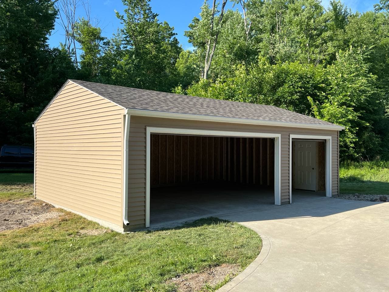 From bare frame to finished garage — drag the slider to witness the Amish transformation.